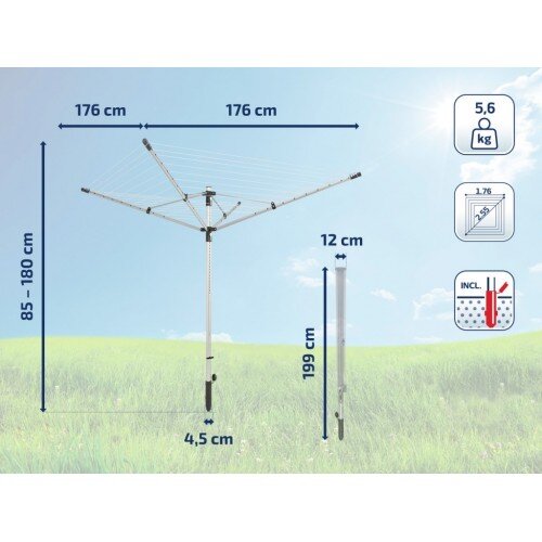 Rotaciono sušilo za veš LEIFHEIT je idealno rješenje za efikasno sušenje veša na otvorenom. Sa visokokvalitetnom konstrukcijom, ovo sušilo omogućava maksimalnu upotrebu prostora, sa lahkoćom se rotira i omogućava brzo sušenje. Pogodno je za velike količine veša, a njegova robusna izrada garantuje dugotrajnost i stabilnost čak i u lošijim vremenskim uslovima.