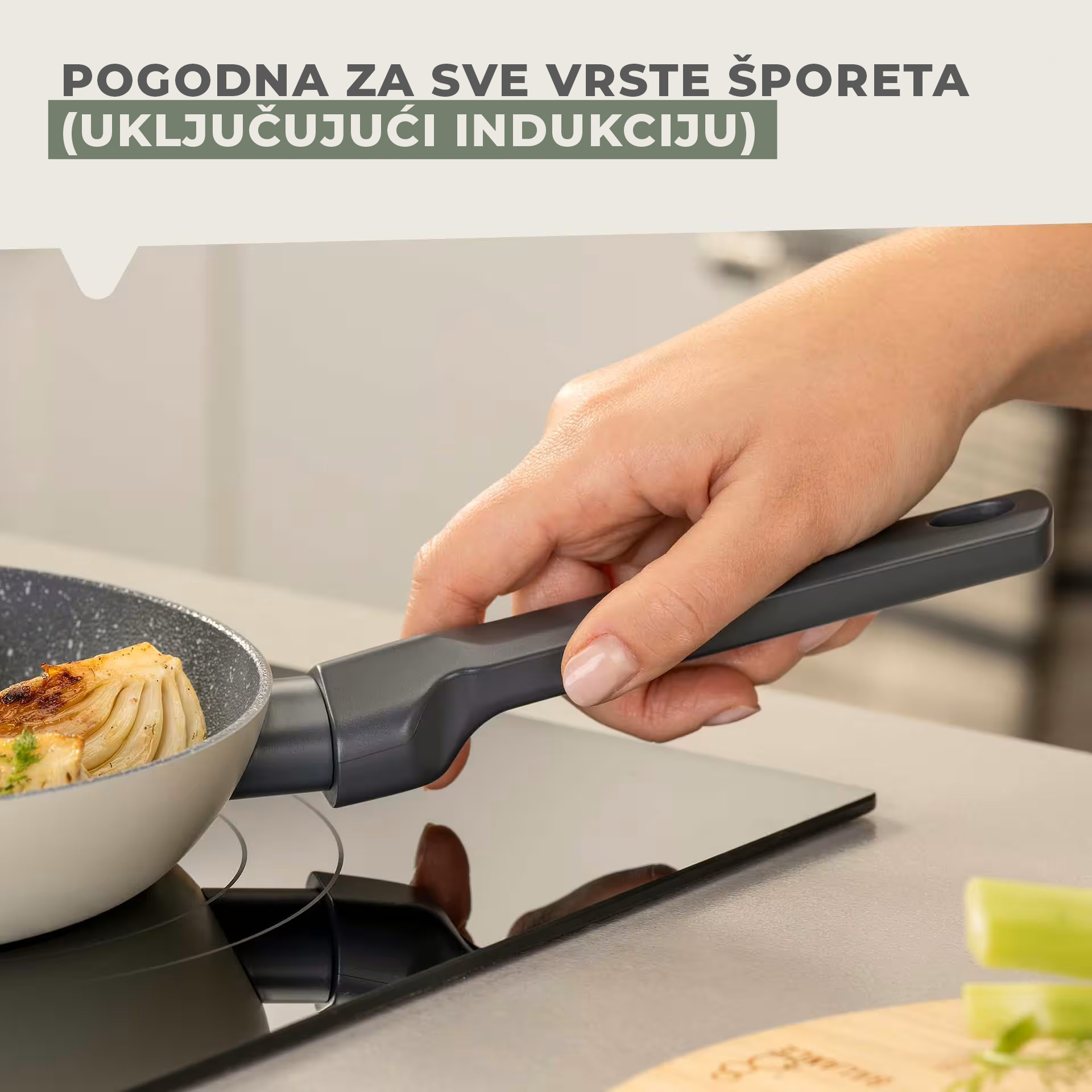 Tava je pogodna za sve vrste ploča za kuhanje, uključujući indukciju, a može se koristiti i u pećnici do 150 °C.
